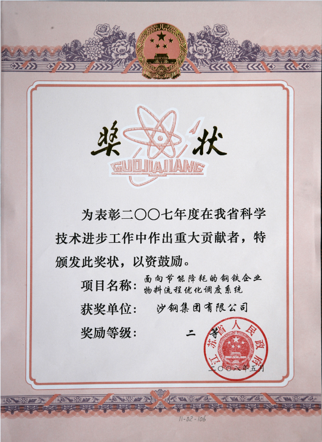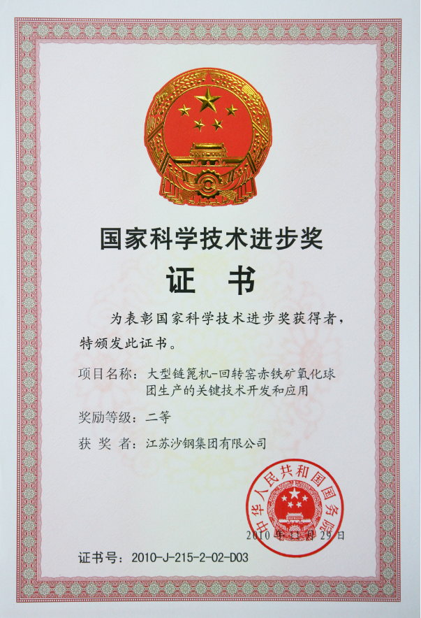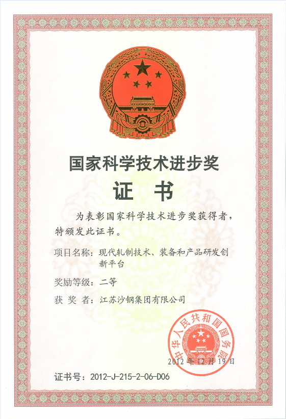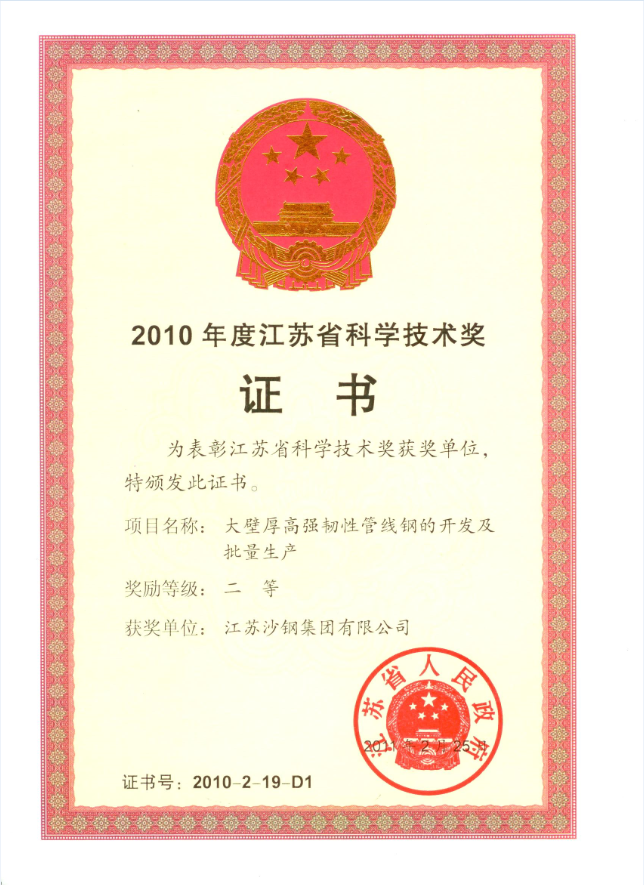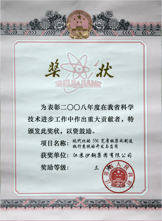 2020年度江蘇省科學技術獎證書——大厚度高性能TMCP鋼板關鍵技術開發及應用