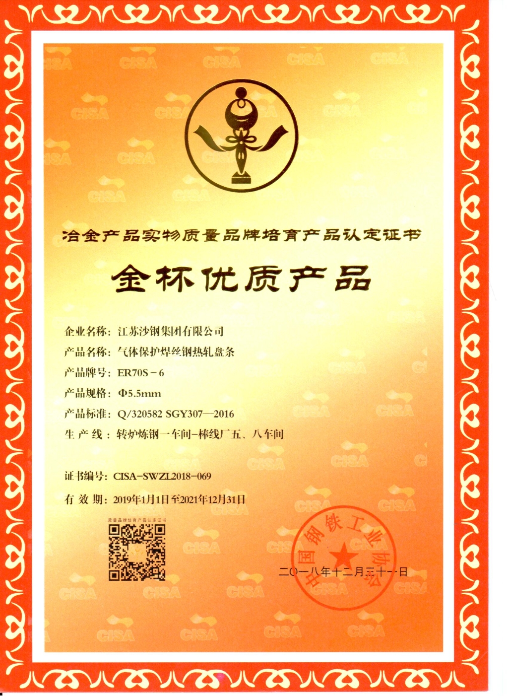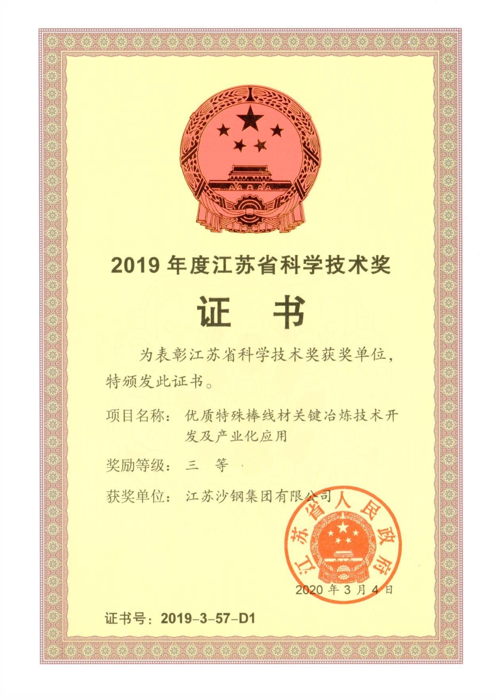 2019年度江蘇省科學技術獎三等獎——優質特殊棒線材關鍵冶煉技術開發及產業化應用