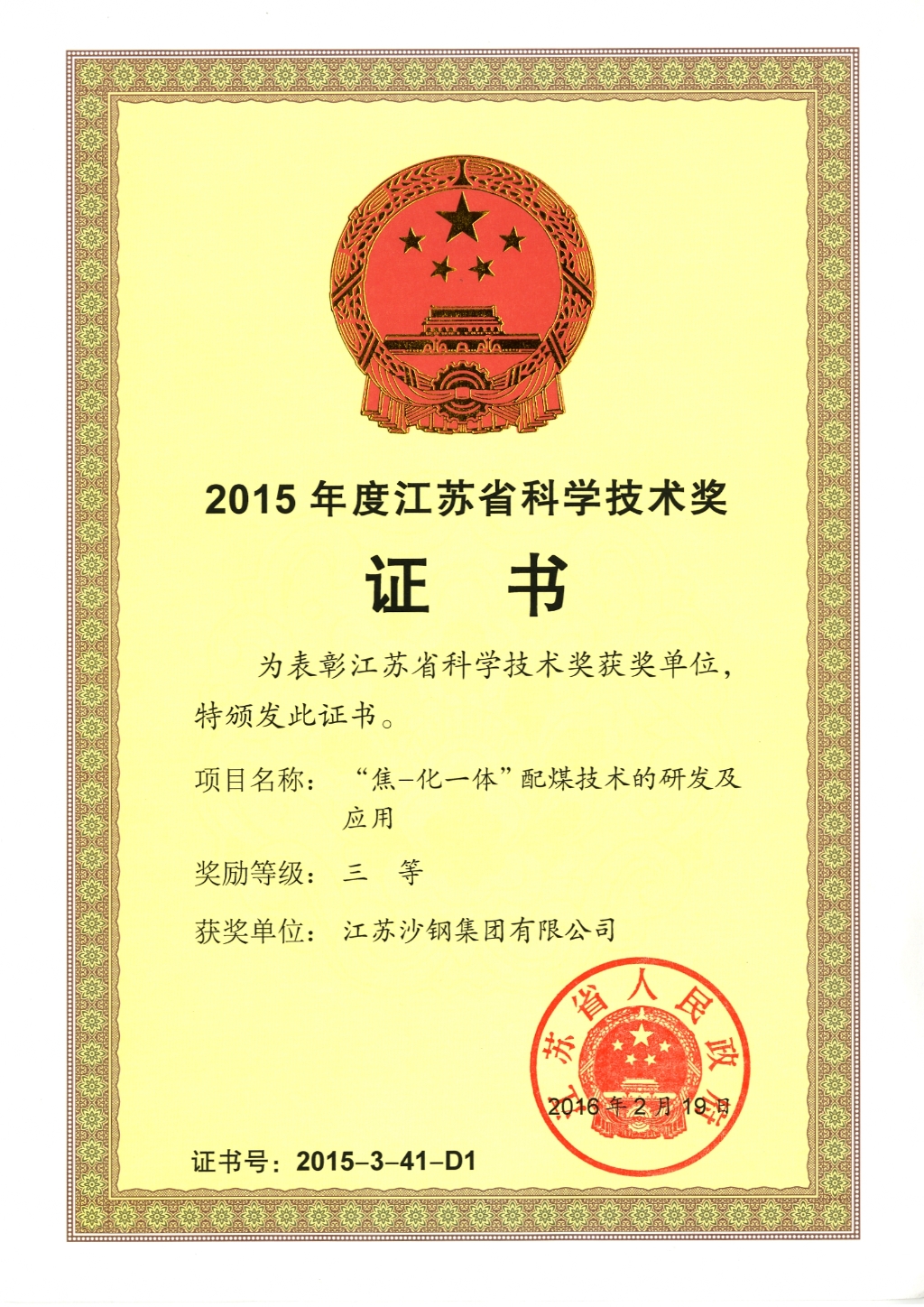2015年度江蘇省科學技術獎三等獎——焦化一體配煤技術的研發及應用