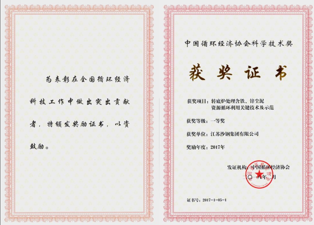 中國循環經濟協會科學技術獎一等獎——轉底爐處理含鐵、鋅塵泥資源循環利用關鍵技術及示范