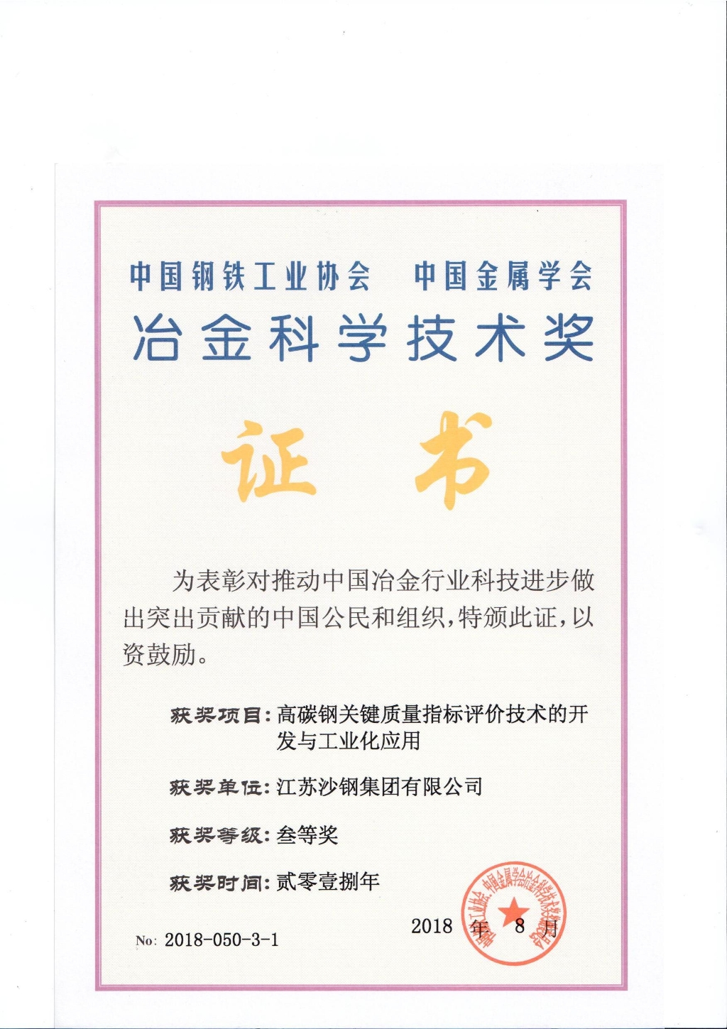 冶金科學技術獎三等獎——高碳鋼關鍵質量指標評價技術的開發與工業化應用