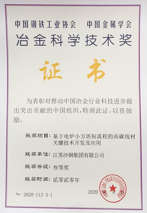 2020年冶金科學技術獎——基于電爐小方坯短流程的高碳線材關鍵技術開發及應用